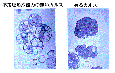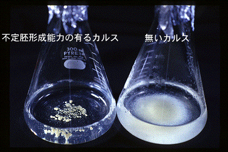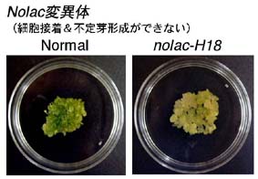我々の樹立した胚を作れないニンジン細胞株では、カルスの細胞同士の接着ができ難くなり、大きな細胞塊を作れなくなっています。