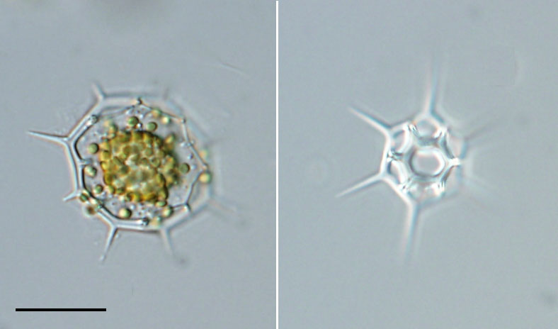 1. Dictyocha speculum var. octonarius. 生細胞. 2. Dictyocha speculum var. speculum. 骨格. 下田沖 (2010.5.17). Scale bar = 20 µm.