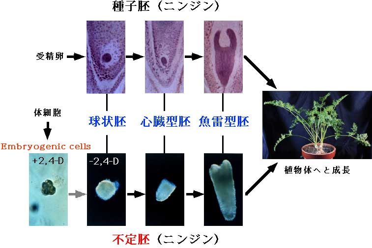 高等植物の細胞には動物などには見られない分化全能性という能力を有している。分化全能性とは、葉や茎や根など特性の明確な組織に分化した体細胞から、再び新しい個体が再生する現象(再分化)を指す。この分化全能性の最も直接的な証拠として、不定胚形成が知られている。不定胚とは、種子中の胚と同じく新しい植物体を形成する基となる組織をさし、種子胚とほぼ同様の特徴を持つ。種子胚が受精によって作り出されるが、不定胚は通常の体細胞から形成されると言う点が最大の違いである。